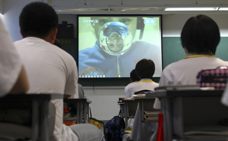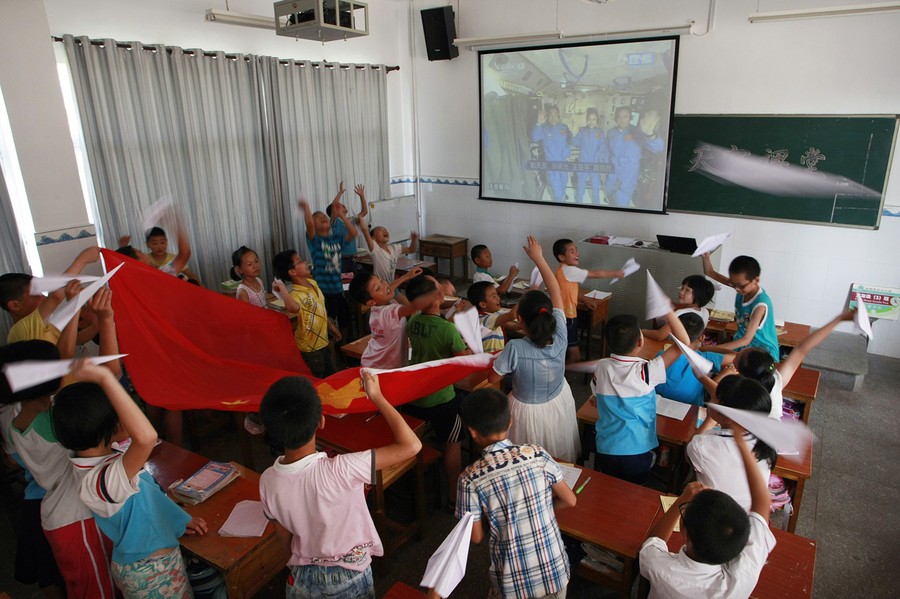 Read moreStudents watch a live broadcast of a lecture given by Shenzhou-10 spacecraft astronauts on the Tiangong-1 space module, at a school in Beijing, on June 20, 2013. Chinese astronauts of the Shenzhou-10 spacecraft gave a lecture from the Tiangong-1 space module, some 340 km (211 mi) above the earth. According to Xinhua News Agency, more than 60 million students and teachers watched the live broadcast on television across the country. #