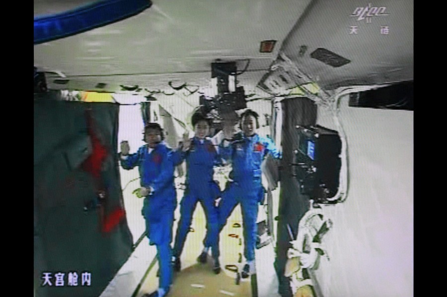 Read moreChinese astronauts from left, Wang Yaping, Nie Haisheng and Zhang Xiaoguang wave from behind a glass enclosure as they arrive to meet the press at the Jiuquan satellite launch center, on June 10, 2013. #