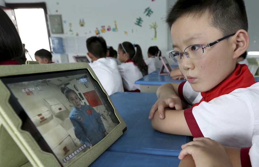 Read moreA student looks at an iPad as his class watches a live broadcast of a lecture given by Shenzhou-10 spacecraft astronauts on the Tiangong-1 space module, at a primary school in Quzhou, Zhejiang province, on June 20, 2013. #