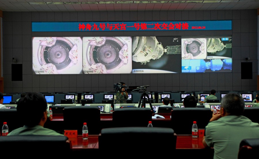 Read moreChinese technicians at the Jiuquan Space Center monitor the Shenzhou-9 spacecraft as it prepares to link with the Tiangong-1 module just over a week into a manned space mission which included China's first female astronaut, following an automatic docking, on June 24, 2012. #