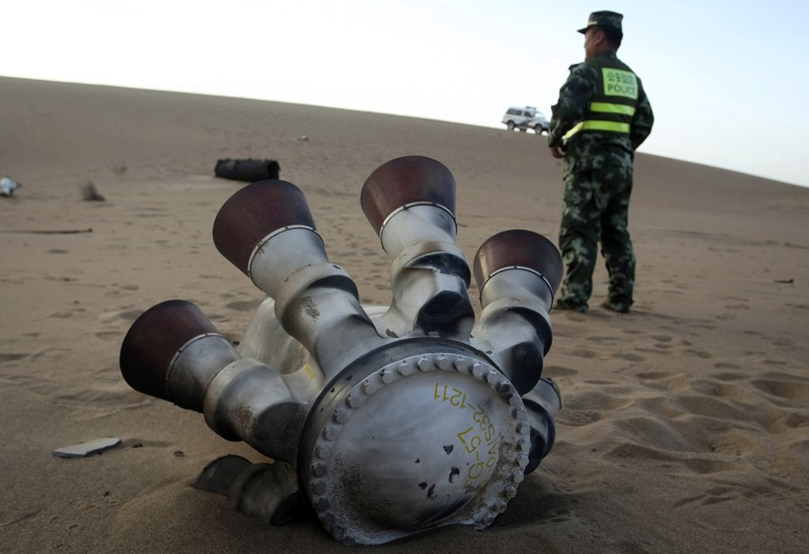 Read moreA policeman stands guard next to a component of the Shenzhou-10 manned spacecraft which was found in Badain Jaran Desert after the launch, in Alxa League, Inner Mongolia Autonomous Region, on June 12, 2013. #