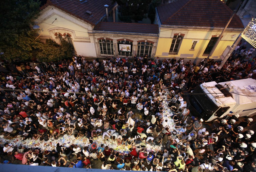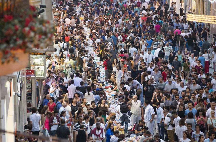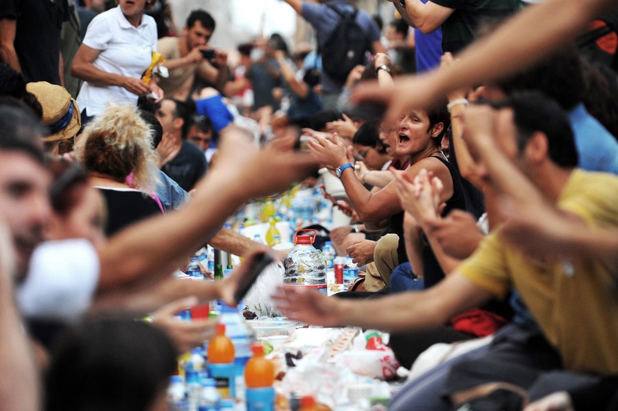 Read moreThousands of people sit on Istiklal Avenue, in Istanbul, Turkey, on July 9, 2013. Thousands broke the fast on the first day of Ramadan in a kind of spontaneous form of protest sitting in a line of some hundred meters from Galatasaray University to Taksim Square on the street chanting slogans while eating together. #