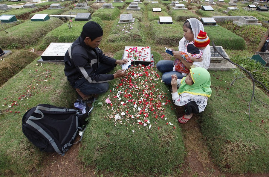 Read moreA family reads verses from the Koran at a relative's grave in a cemetery, a day before the Islamic holy month of Ramadan, in Jakarta, on July 9, 2013. Traditionally Indonesian Muslims will visit the graves of their relatives before and towards the end of the the holy month. #