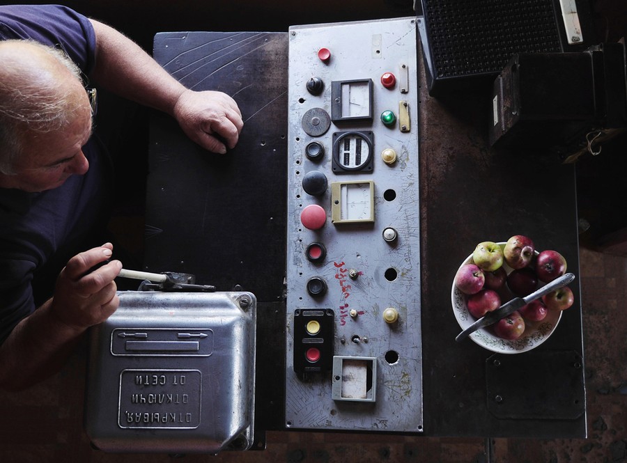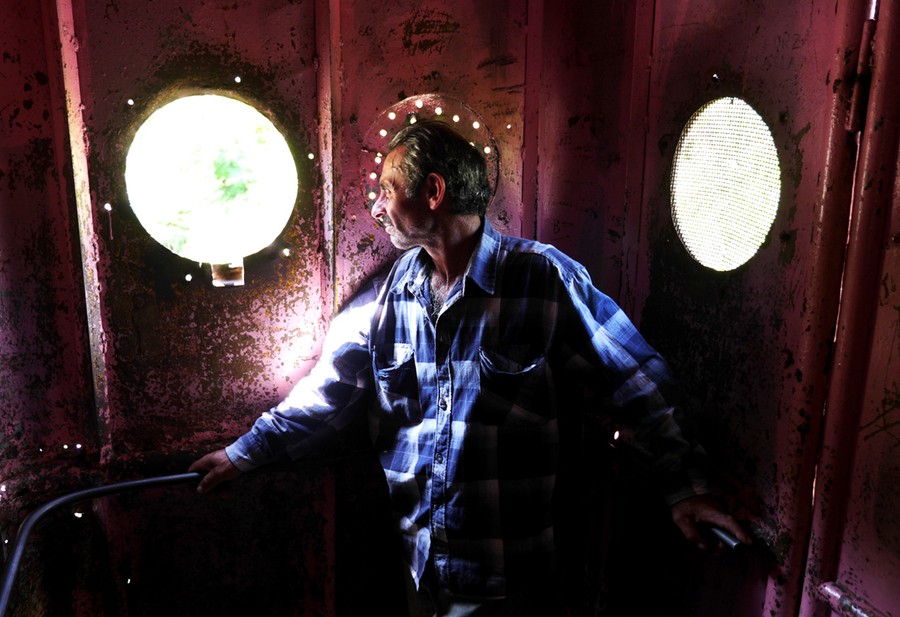 Read moreLeft: A telephone inside a cabin of Tramway 25. Right: A miner smokes a cigarette, leaning through the cabin portholes of the "Peace" tramway which runs from the center of Chiatura up to the entrance of one of the manganese mines. Although owned by the mining company, anyone is free to use the tramway. #
