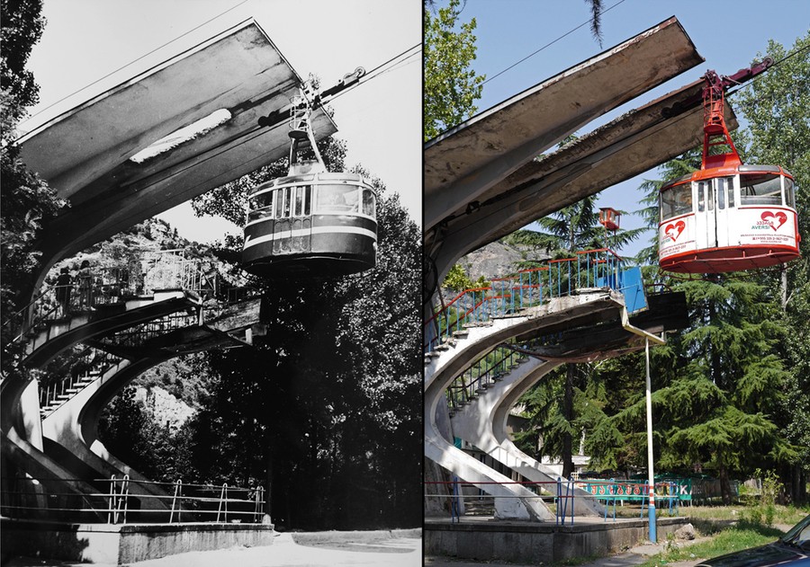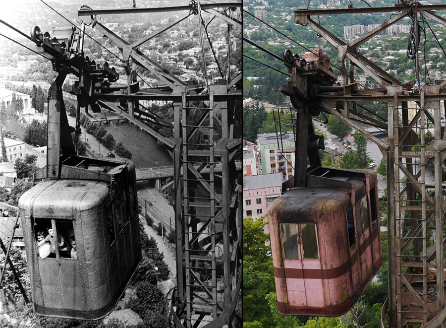 Read moreThen and now pictures of one of the tramways built in the 1960s. In 2008 the hauling rope of this tramway snapped with 12 passengers inside. Ramaz Khipshidze, the director of the Aerial Tramway Network says the automatic braking system worked "thanks to God." Chiatura didn't have the equipment needed to rescue the people inside. For 12 hours the passengers dangled above the town until a team from Tbilisi arrived with a rescue cabin. Although unwilling to specify amounts, Mr. Khipshidze says the passengers were paid compensation, and some accepted the company's offer of counseling. #