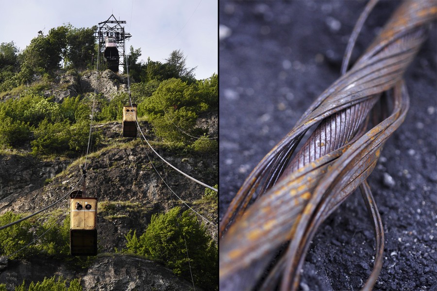 Read moreLeft: Two locals look out over Chiatura from the Peace tramway. The cabins run without a braking system; if the haulage cable snaps, the cabins will roll straight back down the track cable. This happened to a tramway in Georgia's capital Tbilisi in 1990, killing twenty people. Right: A discarded piece of track cable. The cables weigh around 26lb (12kg) per meter. #