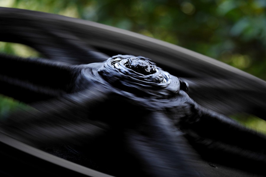 Read moreA heavily greased pulley wheel turns on the Peace tramway. Most tramways in Chiatura use a "jig back" system where two cabins are connected to the same cable. An electric motor pulls one cabin down, using that cabin's weight to help pull the other cabin up. #