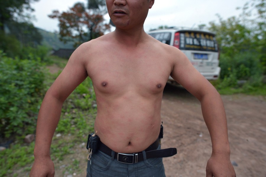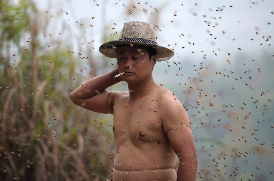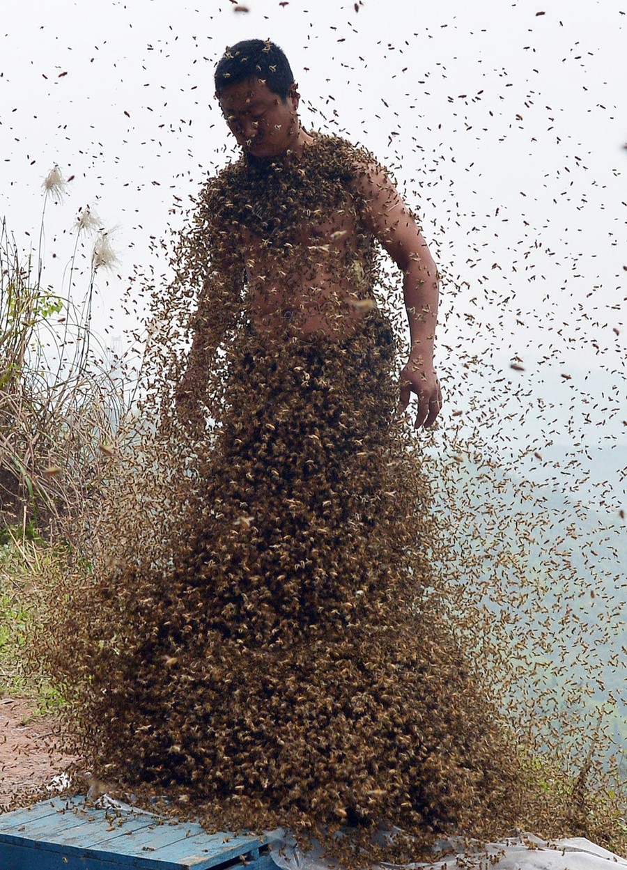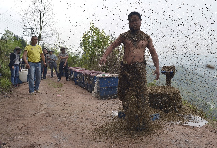Read moreShe Ping, a 34 year-old beekeeper, covered with a swarm of bees on a small hill in southwest China's Chongqing municipality on April 9, 2014. Ping released more than 460,000 bees, using queen bees to attract them to his body, and made himself a suit of bees that weighed 45.65kg (100 pounds) within 40 minutes. #