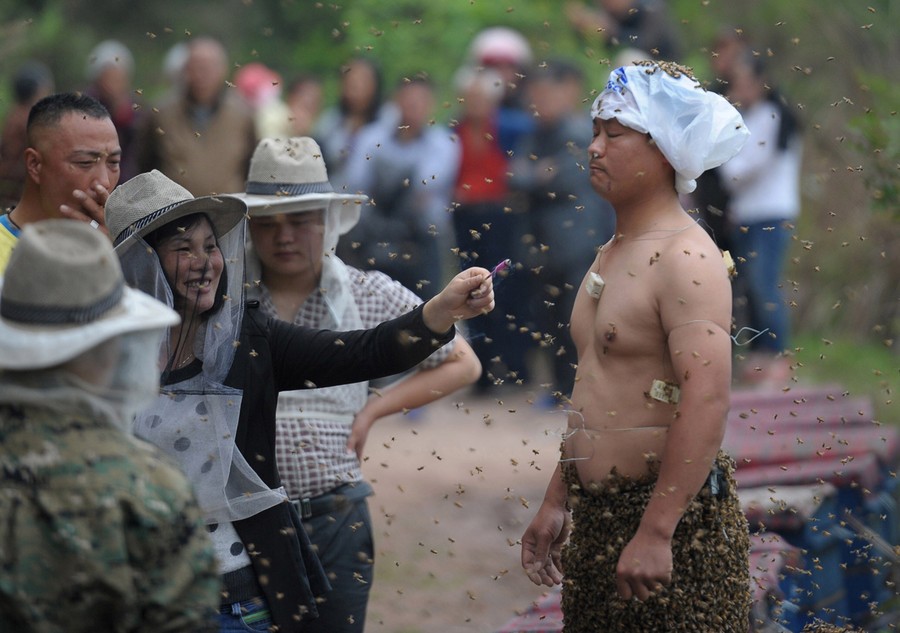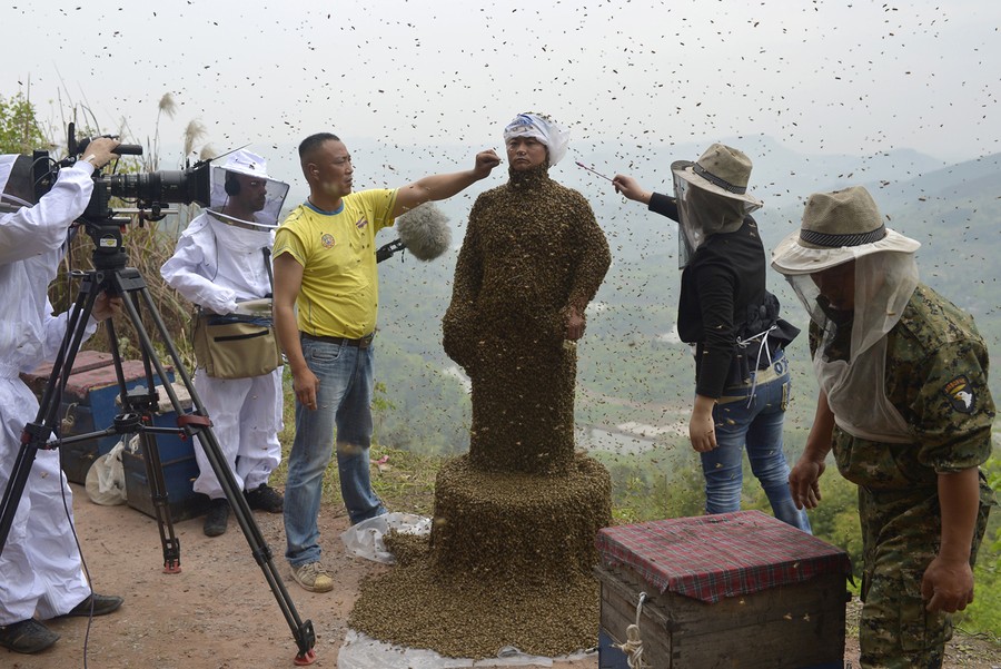 On Wednesday, on a hill in China's Chongqing municipality, 34-year-old beekeeper She Ping covered himself in 460,000 bees weighing 45.65kg (100 pounds) in a publicity stunt to promote his honey sales. The bee suit fell well short of the record 135 lbs claimed by India's Vipin Seth, according to Guinness. Ping claims he was stung about 20 times during the 40-minute stunt.