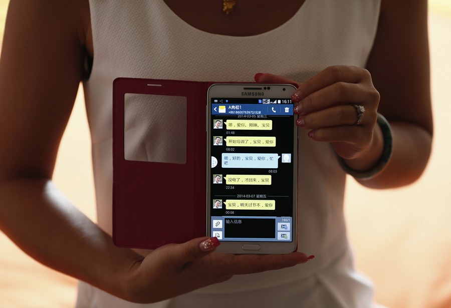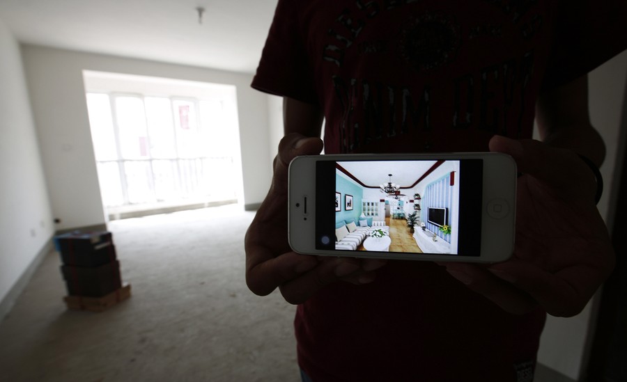 Read moreZhiliang, whose fiancee who was aboard flight MH370, shows an image on his mobile phone, which his fiancee chose as a reference for decorating their newly purchased house (background) in Tianjin on August 26, 2014. #