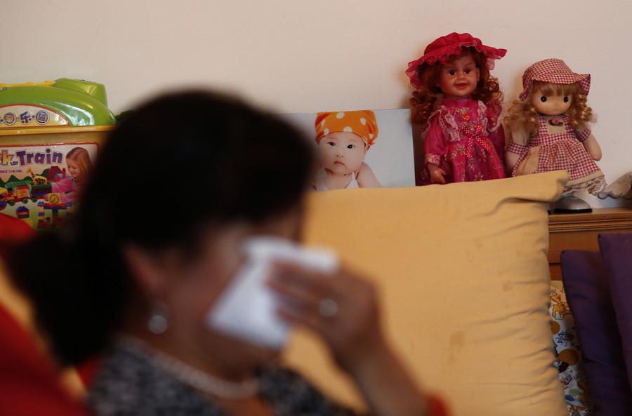 Read moreHu, whose son Zhao's whole family was aboard flight MH370, wipes her tears during an interview with Reuters in Beijing on July 24, 2014 as her granddaughter's picture is seen in the living room of her house. Hu said she had thought of committing suicide. She could not go back home for a while after the incident because she was afraid of entering the empty house which had been filled by her 3 year-old granddaughter's lovely smile. #