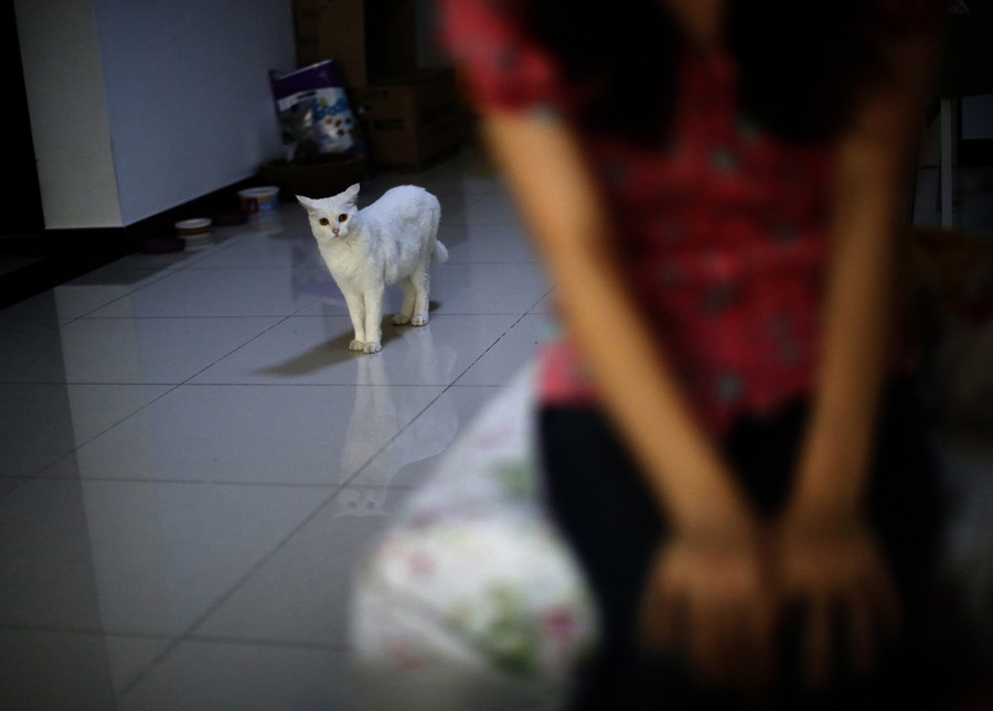 Read moreZhang Xiaomi, a cat raised by Li Zhen and her husband, who was aboard flight MH370, stands behind Li while she gives an interview to Reuters in Beijing on August 21, 2014. Li said her only wish now is that her husband comes home alive no matter how much he has changed. #