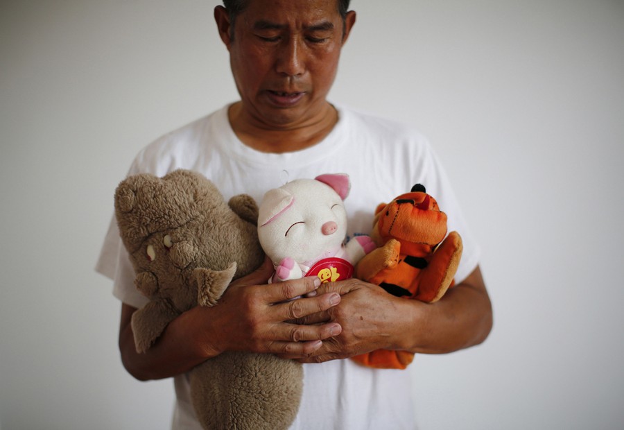 Read moreZhang Yongli, whose daughter Zhang Qi was aboard Malaysian Airlines Flight MH370, holds his daughter's plush toys during an interview in Beijing on July 22, 2014. Zhang said this incident is disrupting the lives of he and his wife now. His wife sometimes roams several kilometers far from home because she cannot stand staying in their home from which her daughter is now absent. #