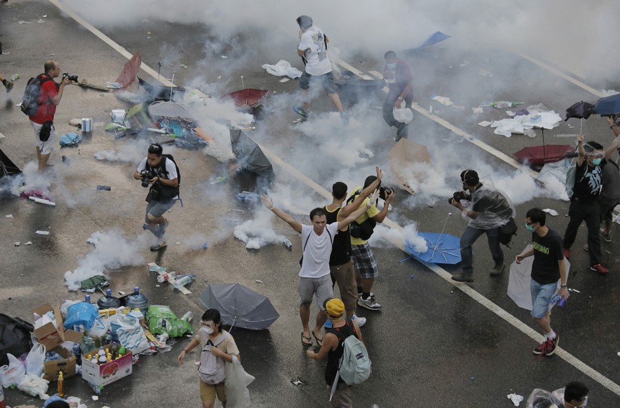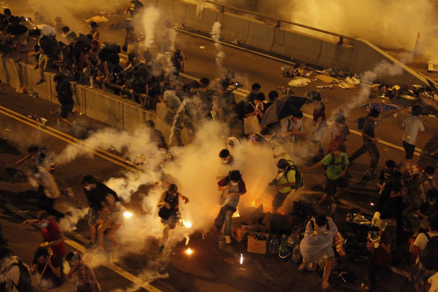 Read moreRiot police fire teargas to disperse protesters in Hong Kong on September 29, 2014. Riot police advanced on Hong Kong pro-democracy protesters in the early hours of Monday, firing volleys of tear gas that sent some fleeing as others erected barricades to block the security forces in the heart of the former British colony. #