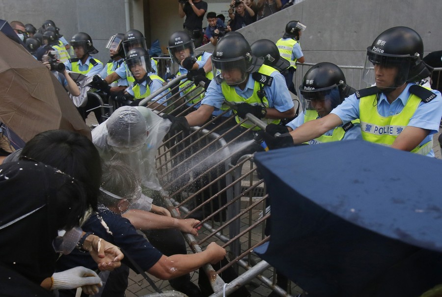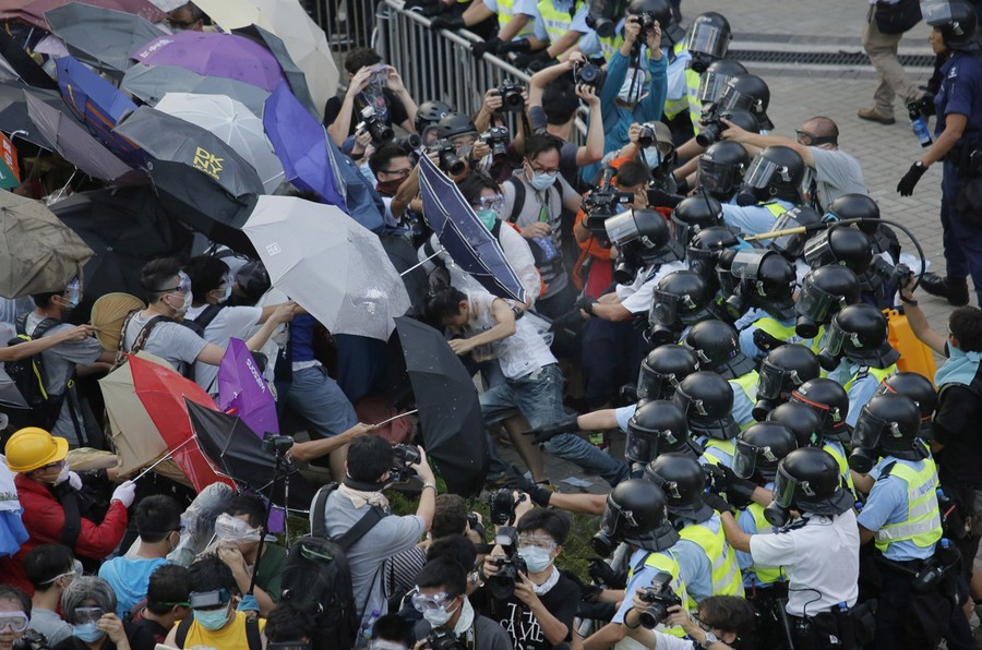 Read moreProtesters take cover from pepper spray with umbrellas as riot police clash with tens of thousands of protesters blocking the main street leading to the financial Central district outside the government headquarters in Hong Kong on September 28, 2014. #