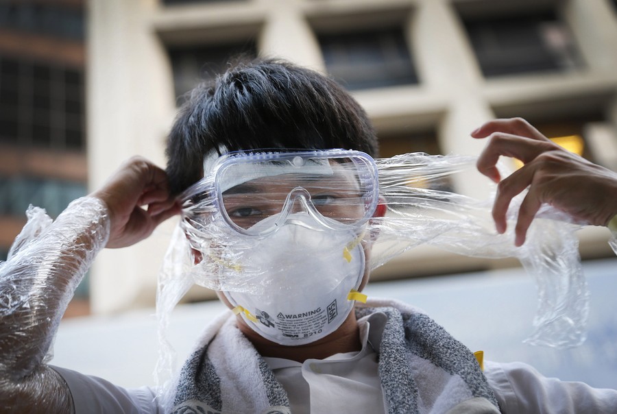 Read moreA student pro-democracy protester covers his face in plastic wrap to protect against pepper spray during a stand-off with local police on September 29, 2014 in Hong Kong. #