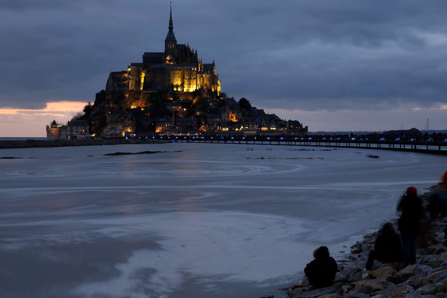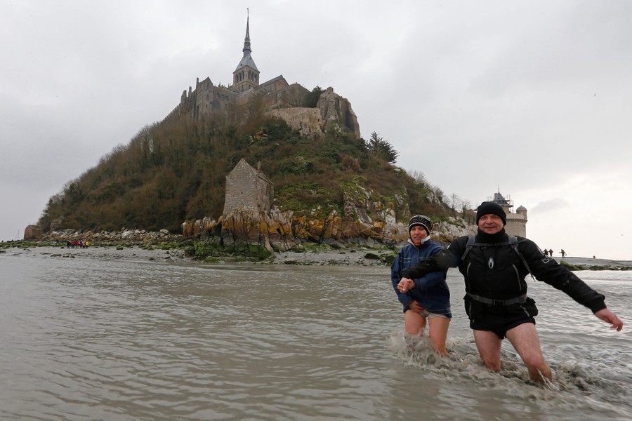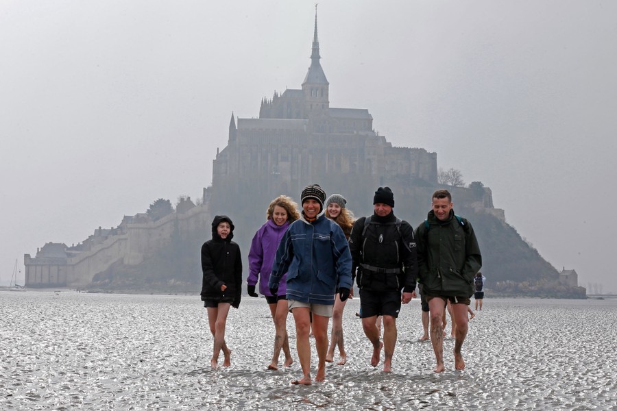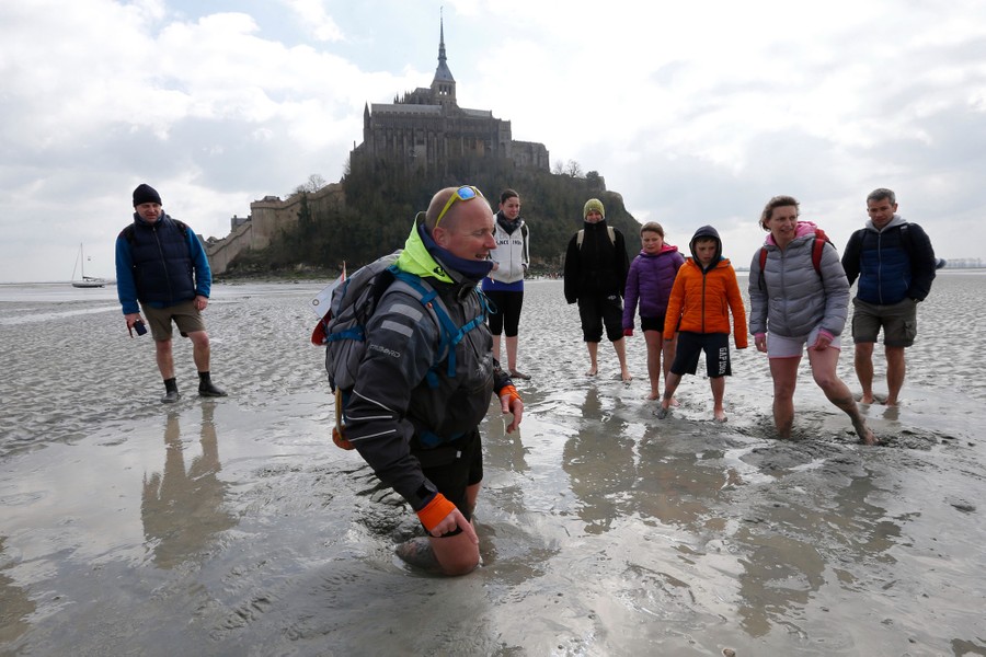 Read moreSebastien Daligault, a guide at the Bay Saint-Michel, stands knee-deep in mud as tourists watch nearby during a walking tour at low tide around the 11th-century abbey on March 21, 2015. #
