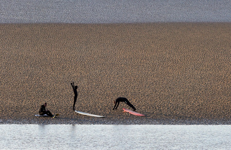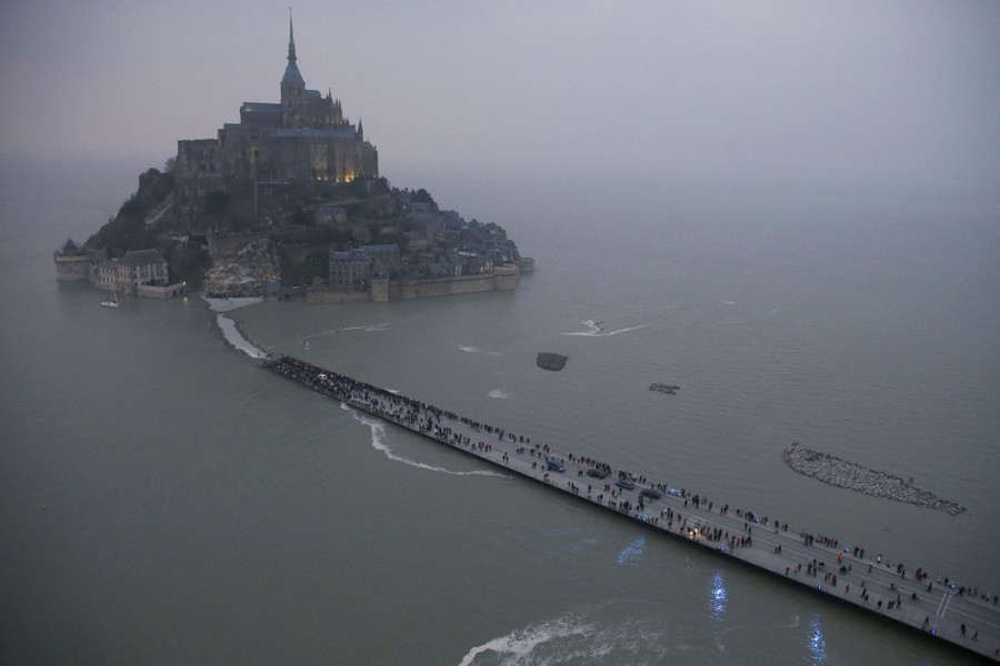 Part of France's North Atlantic coast and southwestern England braced for their first giant tide of the millennium on Saturday as the alignment of the sun and the moon created an ocean surge not seen since the 1990s. This so-called "supertide" or "tide of the century," with surges up to 14 meters high, actually happens every 18 years. The high tides have turned France's famed Mont Saint-Michel into an island, and sent bore tide waves into England's River Severn, and the extreme low tides have exposed areas of beach and rock unseen since 1997.