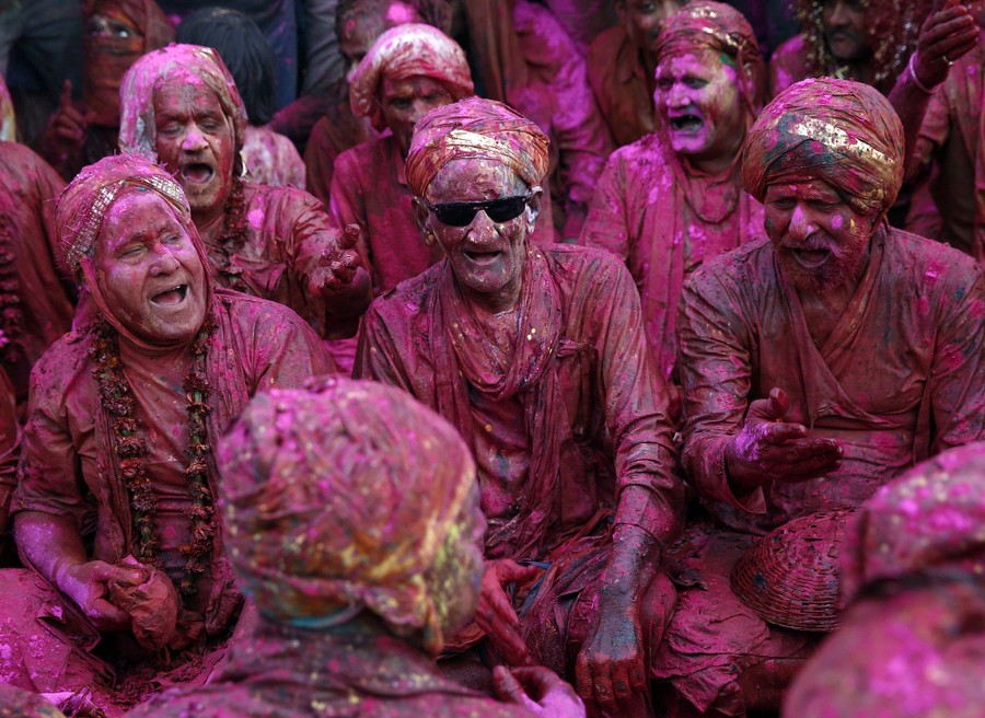 Read moreMen daubed in colors sing religious songs as they celebrate "Lathmar Holi" at Nandgaon, in the northern Indian state of Uttar Pradesh, on February 28, 2015. In a Holi tradition unique to Nandgaon and Barsana villages, men sing provocative songs to gain the attention of women, who then "beat" them with bamboo sticks called "lathis." #