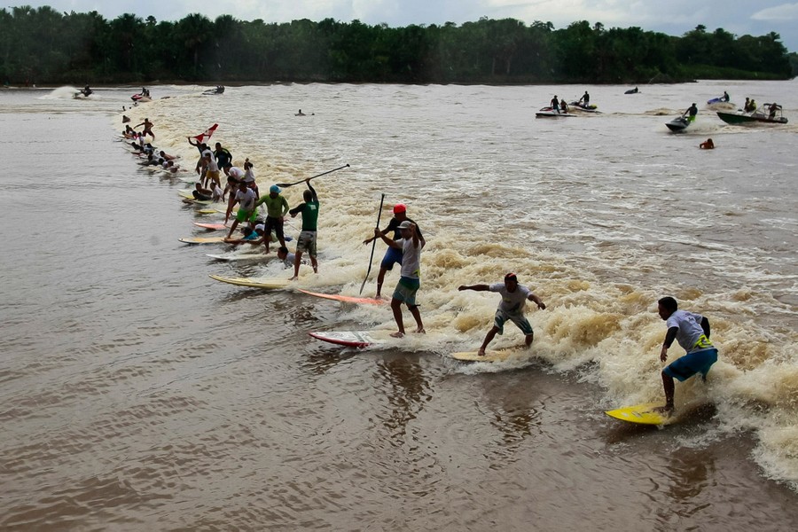 Read morePeople surf on the wave of a tidal bore known as "Pororoca" during the annual surfing Pororoca festival in Sao Domingos do Capim, around 140 kilometers from the state's capital city of Belem, Brazilian northern state of Para, on March 22, 2015. The Pororoca is created during the spring tide as the river water is rolled back by the tides of the Atlantic Ocean on the Amazon River and adjacent rivers. #