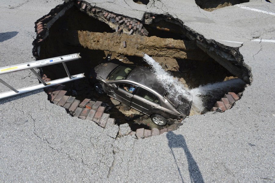 Read morePamela Knox waits for rescue after a massive sinkhole opened up underneath her car in Toledo, Ohio in this July 3, 2013 photo. Toledo firefighters later rescued Knox without major injuries. Fire officials told a local TV station that a water main break caused the large hole. #