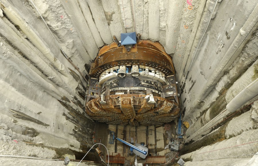 Read moreThe cutting head of "Bertha," the massive tunnel boring machine currently stopped underground near downtown Seattle while waiting for repairs, at the bottom of a 120-foot access pit after a 270-ton section of the front shield was removed and lifted to the surface with a crane on March 19, 2015. The piece is the first of several big crane lifts that will be needed to bring the cutting head and other parts to the surface to complete repairs on the machine, which was digging a 1.7-mile highway tunnel as a replacement for the Alaskan Way Viaduct. #