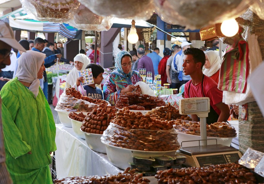 Read moreA vendor sells traditional cakes of fried honey and flour pastries to customers during the first day of Ramadan in the medina of the Moroccan city of Oujda on June 18, 2015. #