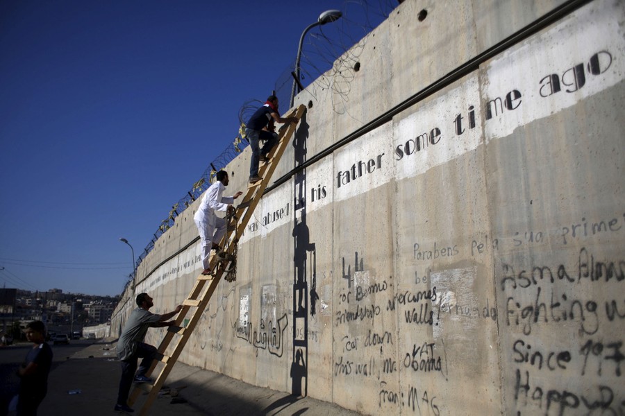Read morePalestinians, not permitted by Israeli security forces to cross into Jerusalem from the West Bank due to an age limit, use a ladder to climb over a section of the controversial Israeli barrier as they try to make their way to attend the fourth Friday prayer of Ramadan in Jerusalem's Al-Aqsa Mosque, in the village of Al-Ram, near Ramallah, on July 10, 2015. #