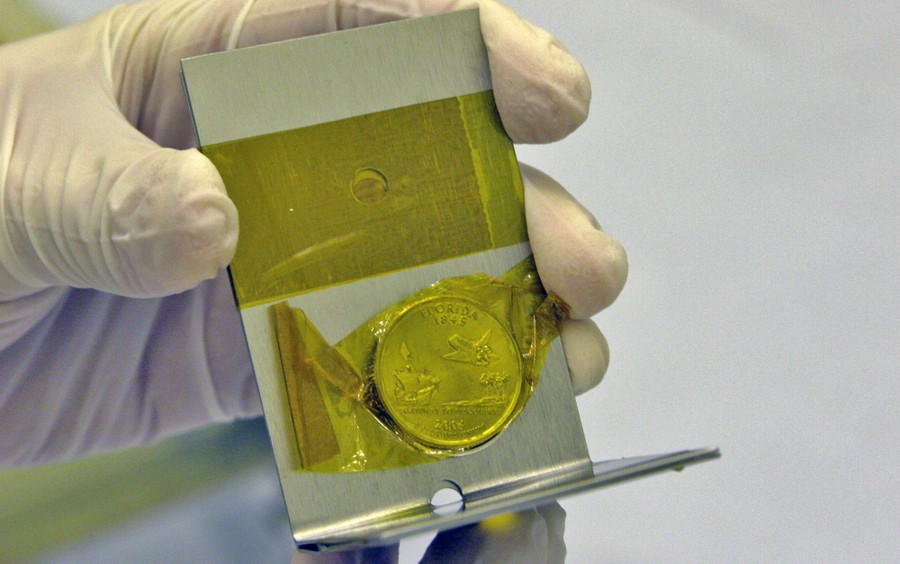 Read moreA 2004 Florida quarter is prepared for installation on the New Horizons spacecraft in Kennedy Space Center's Payload Hazardous Servicing Facility on December 7, 2005. The new quarter, engraved with the "Gateway to Discovery" design, will accompany New Horizons on its 3-billion-mile journey to the dwarf planet Pluto and its moon, Charon. Although appropriate for the mission to carry the coin from the state that symbolizes space exploration, it will also serve a practical purpose: Scientists are using the quarter as a spin-balance weight. #