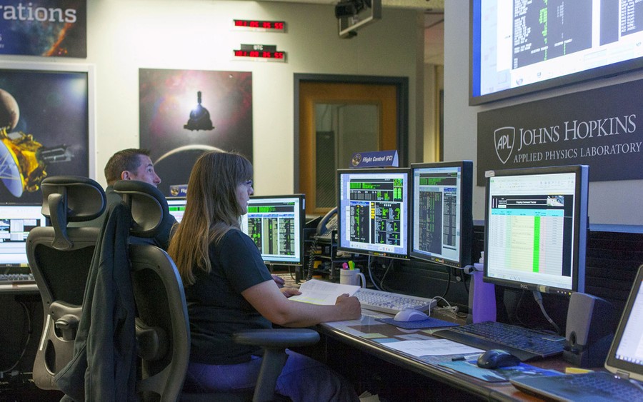 Read moreIn the New Horizons Mission Operations Center at the Johns Hopkins University Applied Physics Laboratory in Laurel, Maryland, flight controllers (from left) Chris Regan and Becca Sepan monitor data from NASA’s New Horizons spacecraft on June 30, after a short course-correction maneuver refined New Horizons’ path toward a flyby of Pluto on July 14. #