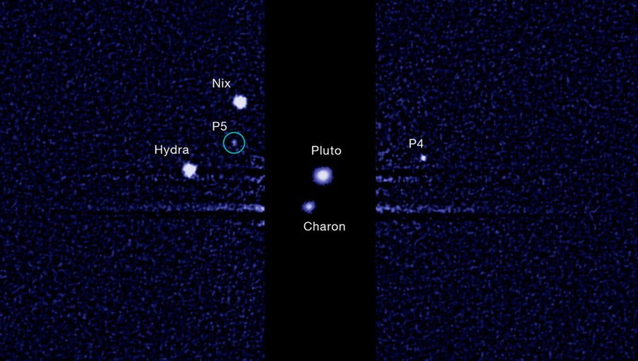 Read moreThis image, taken by the Hubble Space Telescope, shows five moons orbiting the distant, icy dwarf planet Pluto. The circle marks the newly discovered moon, designated S/2012 (134340) 1, or P5, as photographed by Hubble’s Wide Field Camera 3 on July 7, 2012. The moon is estimated to be approximately 6 to 16 miles (10 to 25 kilometers) across, in a 59-000-mile (95,000-kilometer) diameter circular orbit around Pluto that is assumed to be aligned in the same plane as the other satellites in the system. The darker stripe in the center of the image is because the picture is constructed from a long exposure—designed to capture the comparatively faint satellites of Nix, Hydra, P4, and S/2012 (134340) 1—and a shorter exposure designed to capture Pluto and Charon, which are much brighter. #