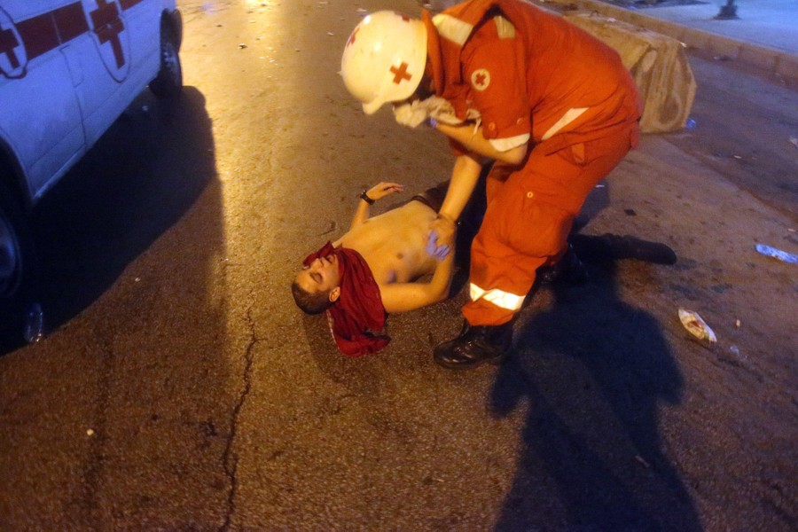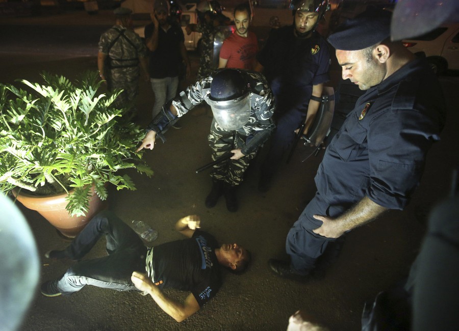 Read moreA Lebanese anti-government protester lies on the ground after he was beaten by the riot policemen standing around him, during a protest in Beirut on August 23, 2015. #