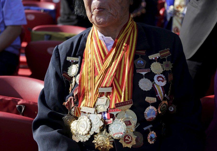 Read moreShen Jilan, wearing insignias and medals, awaits a military parade to mark the 70th anniversary of the end of World War II in Beijing on September 3, 2015. Shen, 85, is the only person in China to be elected 12 consecutive times as a member of China’s parliament, after she was appointed to China’s first National People’s Congress (NPC) in 1954, according to local media. #