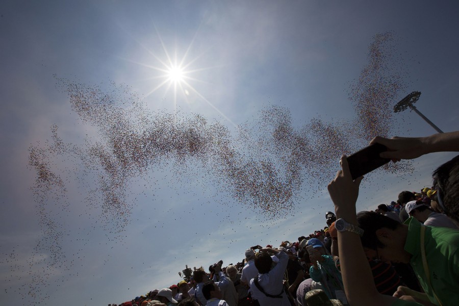 Read moreInvited guests take pictures of a mass of balloons released over Tiananmen Square during a military parade to commemorate the 70th anniversary of Japan’s World War II defeat in Beijing on September 3, 2015. #