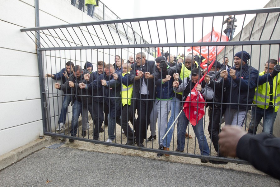 On Monday, October 5, union activists protesting against proposed layoffs at Air France-KLM broke through fences and disrupted a meeting, targeting at least two managers who were forced to flee the angry crowd, their clothes ripped from their backs. Air France-KLM had just announced a restructuring plan that would lead to 2,900 job cuts after pilots had refused to accept a proposal to work longer hours. Director of Air France in Orly Pierre Plissonnier and Air France Human Resources Director Xavier Broseta bore the brunt of the protest, eventually escaping over a fence with the help of security team members.