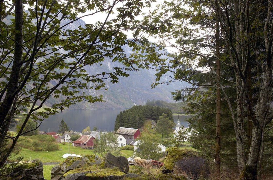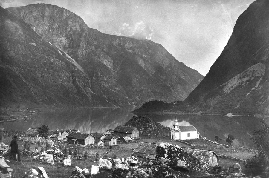 Read moreBakka on the Nærøy fjord, Aurland municipality, seen circa 1890, and again (click to fade) in 2004. In 2005, the fjords of Nærøy and Geiranger were listed on UNESCO’s list of world-heritage sites as western Norwegian-fjord landscapes. The oldest picture shows an environment typical of the time before the first Great Change: many small buildings and an open landscape characterized by manual farming. Today the buildings show a surprising lack of change, while the surrounding landscape has become more wooded. This is due to both natural regrowth and the planting of spruce. [Click the image to view transition.] #