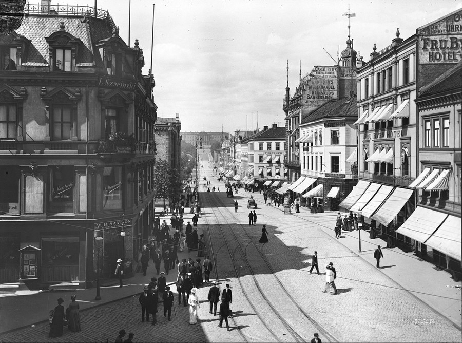 Read moreKarl Johans gate in Oslo, seen circa 1899 and again (click to fade) in 2007. Karl Johans gate is known as Norway’s number one boulevard. Its name came from the Swedish-Norwegian king Karl III Johan in 1852. Here, the street can be seen from Egertorget to the Castle, a stretch which before 1852 was briefly called Slottsveien. The pictures show that Karl Johan’s façade has changed relatively little since the turn of the century. [Click the image to view transition.] #