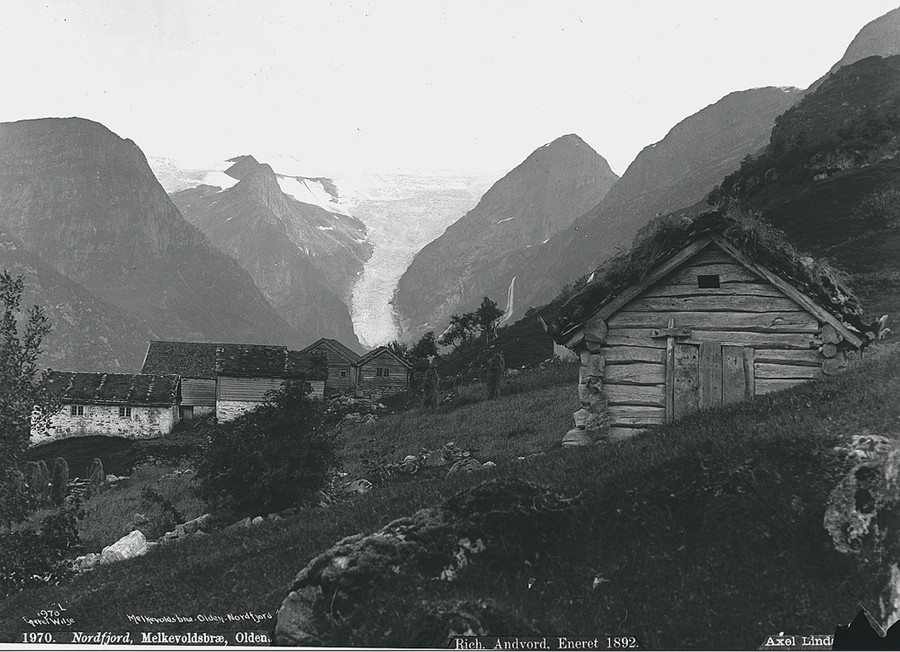 Read moreA view of Melkevollbreen Glacier, in Stryn, Sogn og Fjordane in 1888 and (click to fade) 2007. By comparing older photographs of farms with the same farm today, it is surprising to see how often old houses have been preserved. This is especially the case in the inner courtyard where storehouses and farmhouses are often the oldest still standing. The picture from Yri in Stryn shows that three of the five buildings from 1888 still exist. The stone walls of two of them are particularly easy to see. The house foremost in the picture was a mill, but is no longer there. [Click the image to view transition.] #