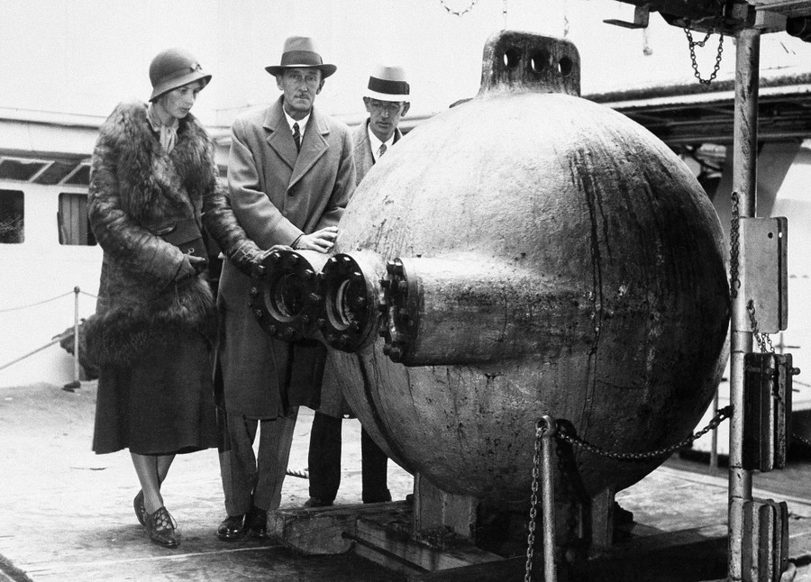 Read moreDr. William Beebe, center, and two of his assistants, Gloria Hollister, left, and John T. Van, stand beside their bathysphere after their arrival in New York from Bermuda, on November 23, 1932. Dr. Beebe and company had conducted deep-sea explorations in the bathysphere in Bermuda. #
