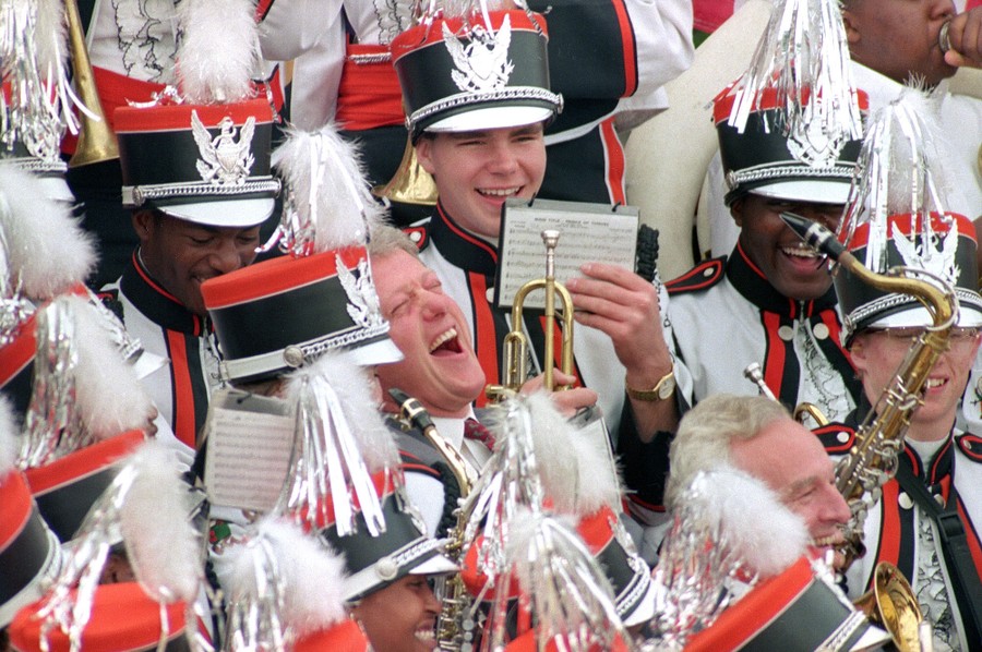 Read moreThen U.S. President-elect Bill Clinton, center, leans back and laughs as he plays the saxophone with the Sugar Bear marching band of Central High School during a City Hall rally in Macon, Georgia, on November 23, 1992. #