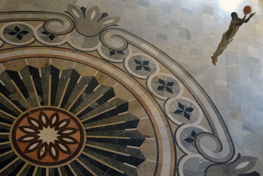 Read moreA US Army soldier from the 1-22 Battalion of the 4th Infantry Division (Task Force Ironhorse) shoots during a basketball game inside one of ousted Iraqi leader Saddam Hussein's former palaces along the banks of the Tigris river in Tikrit, Iraq, on November 23, 2003. #