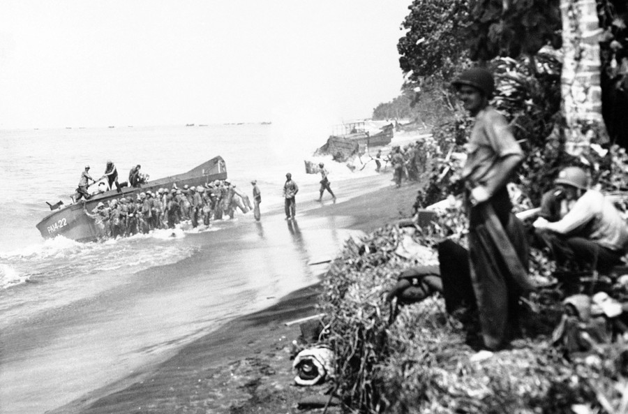 Read moreA group of Marines, after landing on the beach at Bougainville, Papua New Guinea, during a struggle to push a landing boat back into deep water after it was beached when the tide went out on November 23, 1943. Note the landing craft in the background being pounded by the heavy surf. #