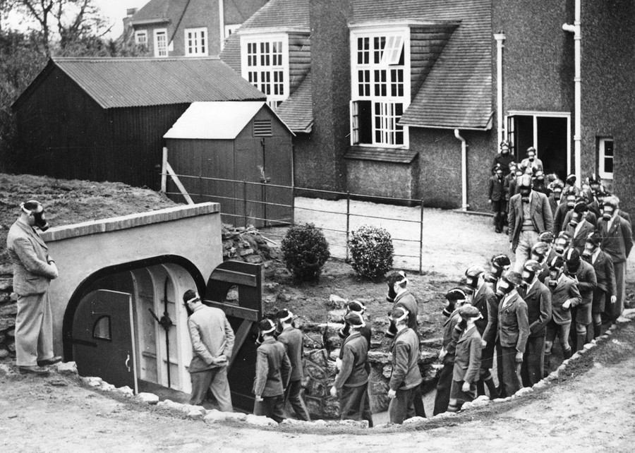 Read moreHeadmaster Sims, left, watches as students of Dorset House Preparatory School file into a bomb-proof shelter in their first air raid drill in Littlehampton, England, on November 23, 1938. The air raid shelter was built under the cricket ground and was paid for by the parents of the boys. #