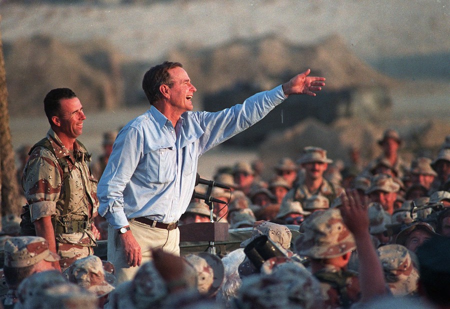 Read morePresident George Bush tosses presidential tie clips to U.S. Marines at a desert encampment in eastern Saudi Arabia on November 23, 1990, during a Thanksgiving visit. #