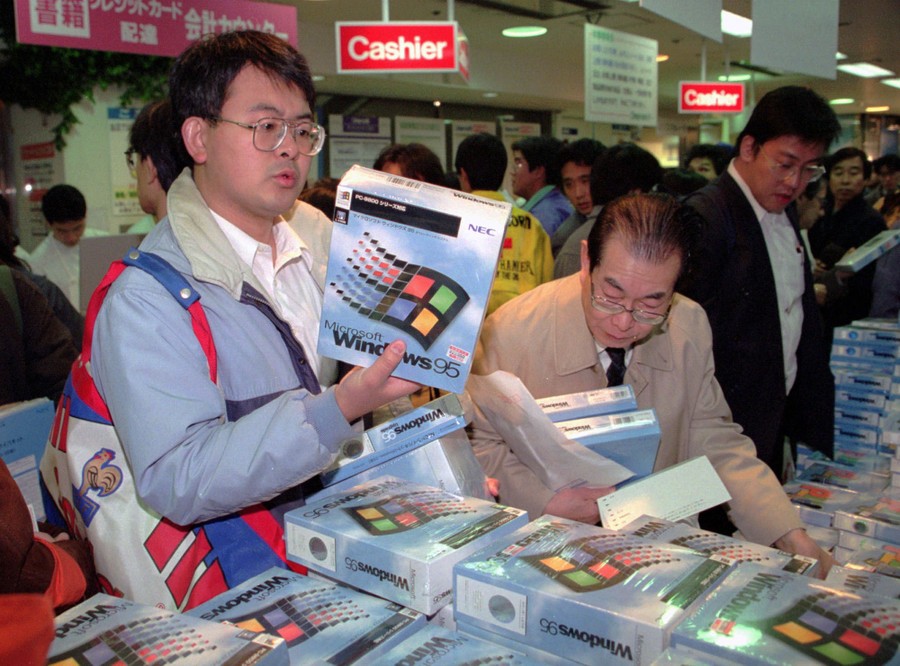 Read moreCustomers examine the Japanese language version of Windows 95 moments past midnight, on November 23, 1995, in a store in Tokyo's Akihabara electronic district. That Thursday's debut gave Japanese a taste of the worldwide hype surrounding the computer operating system, released in English three months previous. #