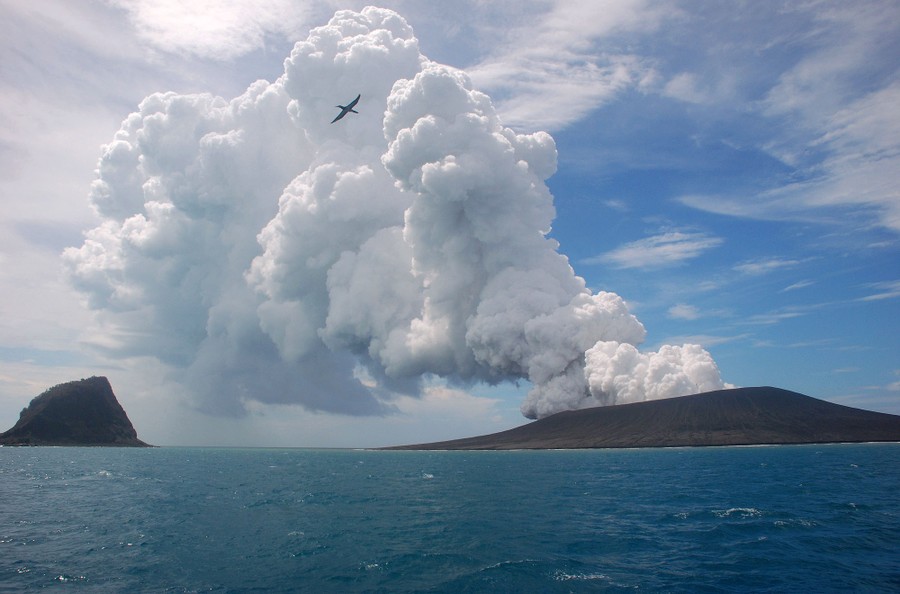 Read moreThis view taken on January 17, 2015, from a boat at sea shows a frigatebird flying on the thermals from the new vent as steam and gas rise from the eruption of a volcano, some 65 kilometers (40 miles) northwest of the South Pacific nation, Tonga's capital, Nuku'alofa. The Tongan volcano has created a substantial new island since it began erupting in December, spewing out huge volumes of rock and dense ash that has killed nearby vegetation, officials said on January 16. The Lands and Natural Resources Ministry said the volcano was erupting from two vents, one on the uninhabited island of Hunga Ha'apai and the other underwater about 100 meters offshore. #