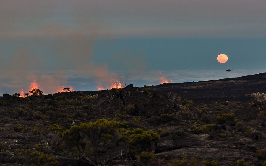 Read moreA helicopter flies overhead as lava flows out of the Piton de la Fournaise volcano as it erupts on May 17, 2015, on the French island of Réunion in the Indian Ocean. #