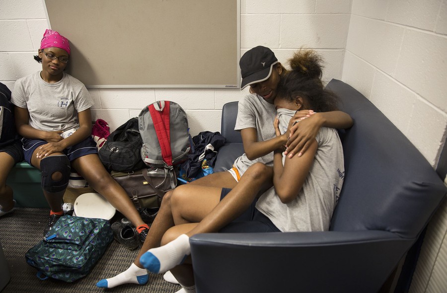 Read moreKarrington Rice, a junior, comforts Ashanti Bailey, a senior, while she succumbs to nerves just hours before their first performance. Bailey is one of two drum majors, the top position of the marching band. Bailey said she was nervous about being compared to the past drum majors. Bailey played the piccolo and flute before becoming a drum major. She wants to study chemical engineering when she goes to college. #