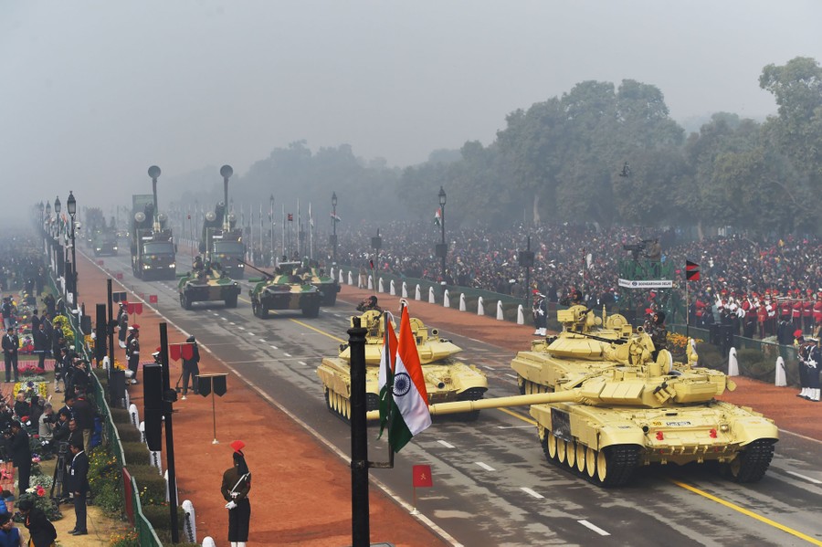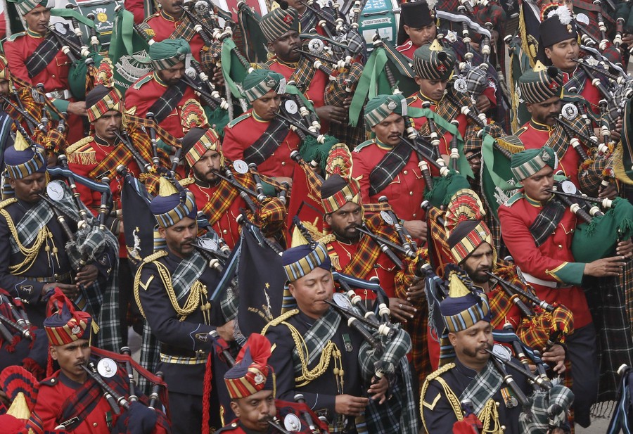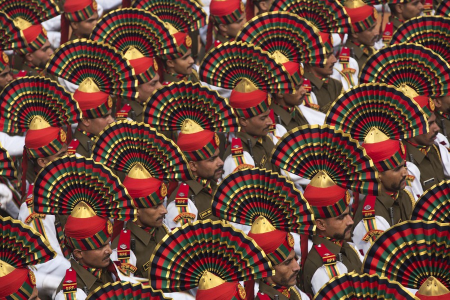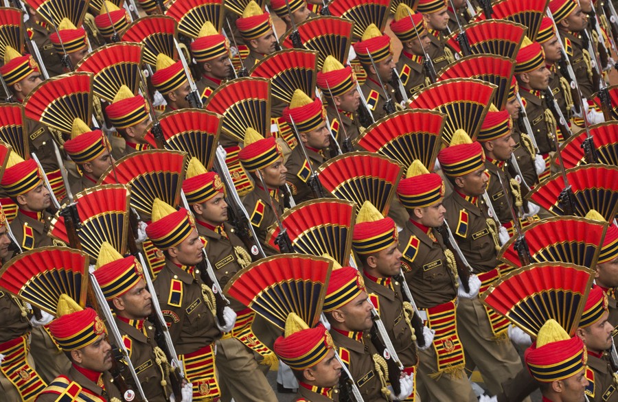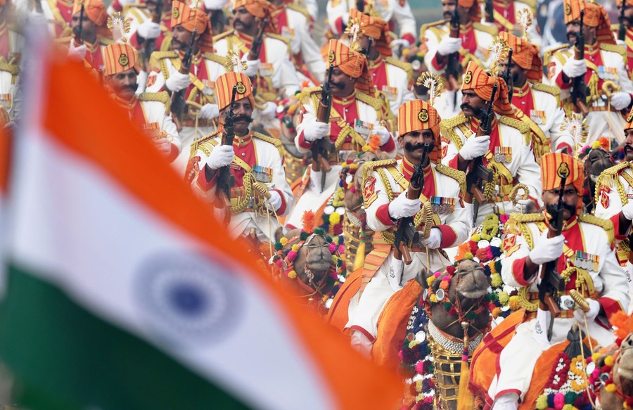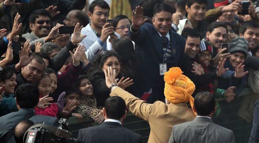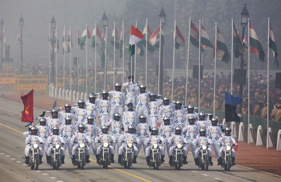 Today, India held its 67th Republic Day celebration, honoring the day in 1950, when it adopted its current constitution. French President Francois Hollande was among the guests of Indian Prime Minister Narendra Modi invited to view the spectacle of the parade held in New Delhi, filled with marching bands, floats, camels, military hardware, and stunt performers.