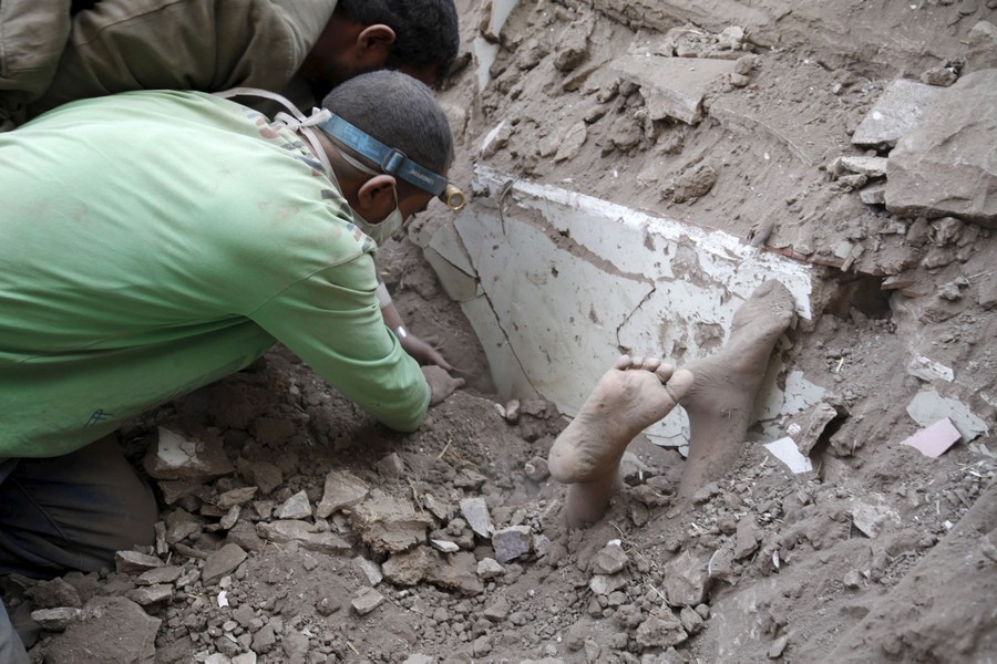 Read moreThe feet of a child covered in dust are seen as people search for survivors under the rubble of a house destroyed by an air strike at the old quarter of Yemen's capital Sanaa on September 19, 2015. At least ten Yemeni civilians were killed in air strikes by Saudi-led warplanes that targeted this neighborhood, medical sources said. #